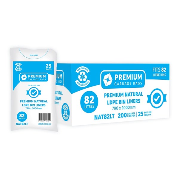 • 82L Premium Bin Liner ? Clear is made from High quality virgin LDPE, foodsafe, super durable with great stretch. Great for recycling or when you need complete transparency