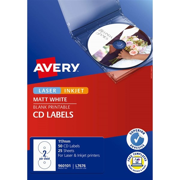 AVERY 960101 L7676-25 LASER LABEL FULL FACE CD/DVD 2/SHT 117MM DIAMETER MATT WHITE PK25SHTS