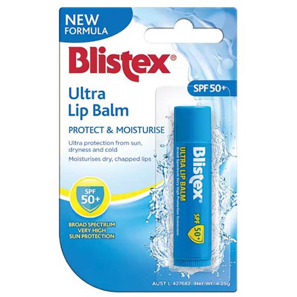 • With very high protection sunscreen, Blistex Ultra Lip Balm SPF 50+ guards your lips against the extreme effects of the Aussie sun, dryness and the cold