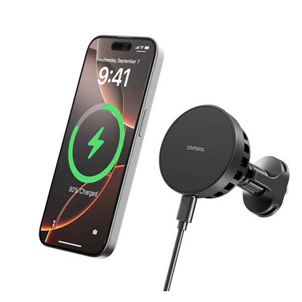 The Comsol Qi2 Cooling Wireless Car Charger Vent/Dash Black WCQ2CF is designed to provide fast, efficient, and cool wireless charging for Qi2-enabled smartphones while driving