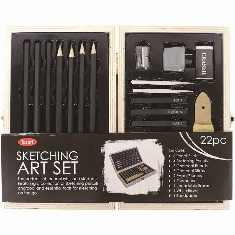 • Sketching Wooden Art Box Set 22 includes: 6 Pencil Sticks, 4 Sketching Pencils, 3 Charcoal Pencils, 3 Charcoal Sticks, 2 Paper Stumps, 1 Sharpener, 1 Kneadable Eraser, 1 White Eraser, 1 Sandpaper