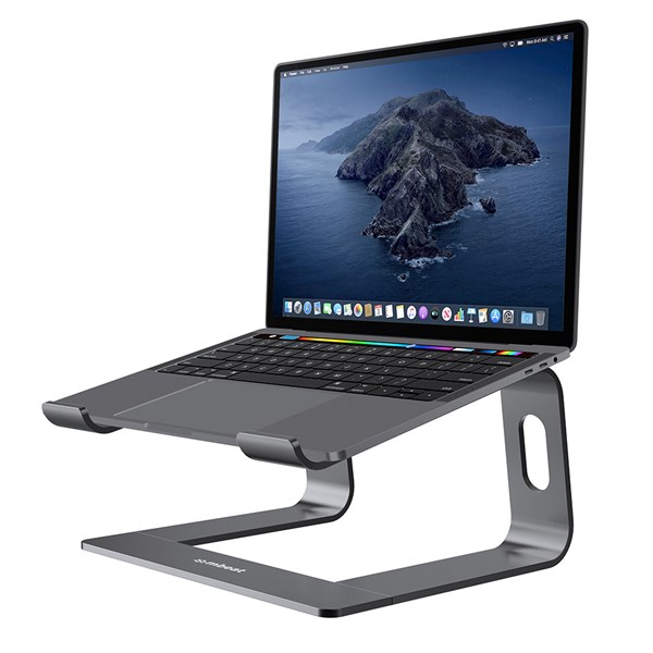 The Mbeat stage S1 elevated laptop stand is crafted from durable aluminum alloy with a silicon grip, designed to reduce eye and neck strain while enhancing airflow to keep your laptop cool