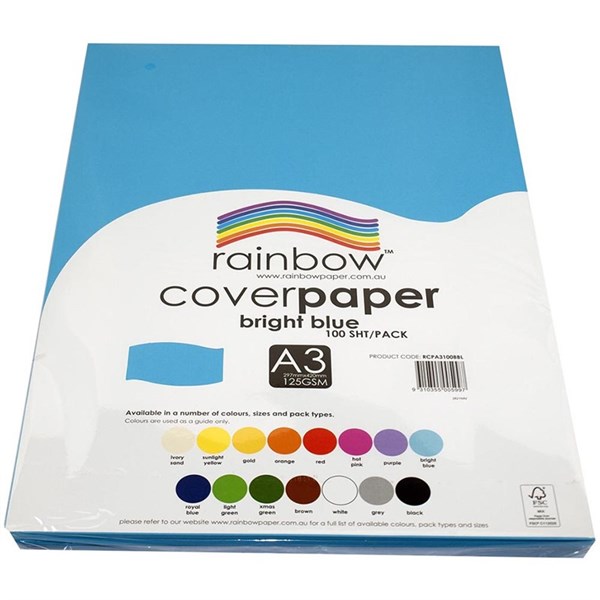 RAINBOW COVER PAPER 125GSM A3 BRIGHT BLUE PACK 100