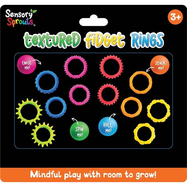 • Each ring features a different texture such as ridges, bumps, and waves that can be rolled, spun or pressed to provide calming tactile stimulation