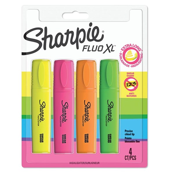 SHARPIE 1825662 FLUO XL HIGHLIGHTER FLAT TANK CHISEL POINT 5.0MM ASSORTED PACK 4