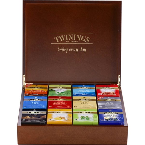 A beautiful Twining's Tea Chest containing a combination of black tea, green tea and infusions in a uniquely crafted wooden box