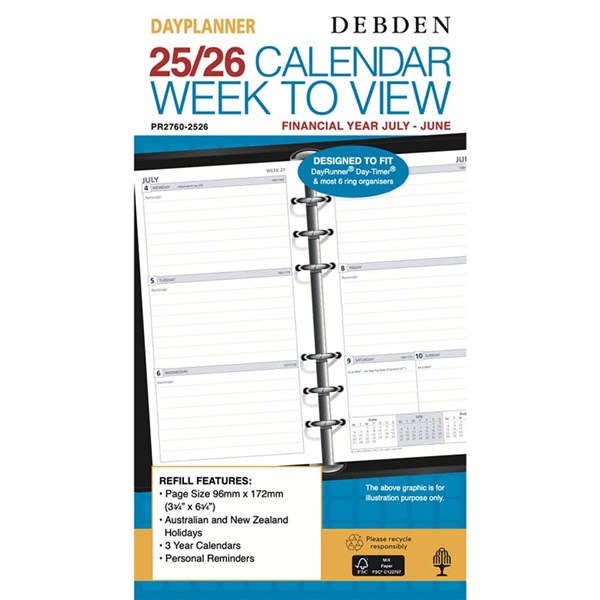 2025-2026 DEBDEN DAYPLANNER PR2760 FINANCIAL YEAR DIARY REFILL WEEK TO VIEW 172 X 96MM WHITE