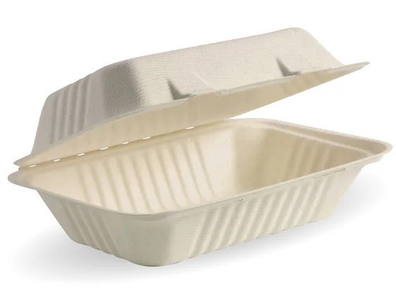 Our plastic-free clamshells are made from rapidly renewable sugarcane pulp, a by-product of the sugar refining industry. Our 9x6x3" natural bagasse clamshell containers are an eco-friendly alternative to plastic takeaway containers.