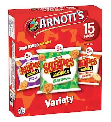 Arnott?s Shapes Originals Variety Pack keeps everyone happy with 15 snack-size bags of the classics?Pizza, BBQ and Chicken Crimpy. Each 25 g bag is oven-baked, loaded with flavour you can see, and perfect for lunch boxes, desk drawers or road trips. The 375 g box is an easy way to stock up on an Aussie icon.