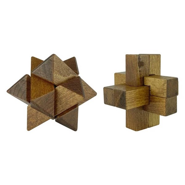 Challenge the mind with this puzzle, featuring six identical wooden pieces that interlock to form a 3D shape