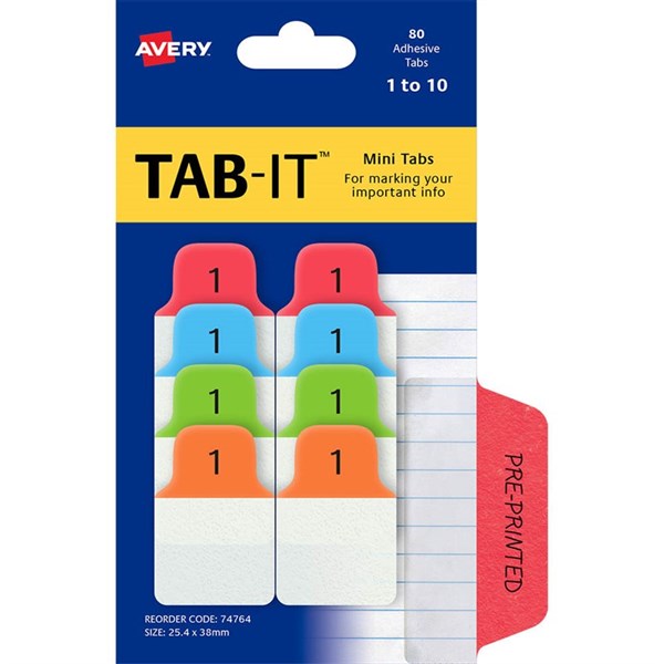 AVERY 74764 MINI TABS NUM 1-10 25.4 X 38MM PRIMARY PACK 80