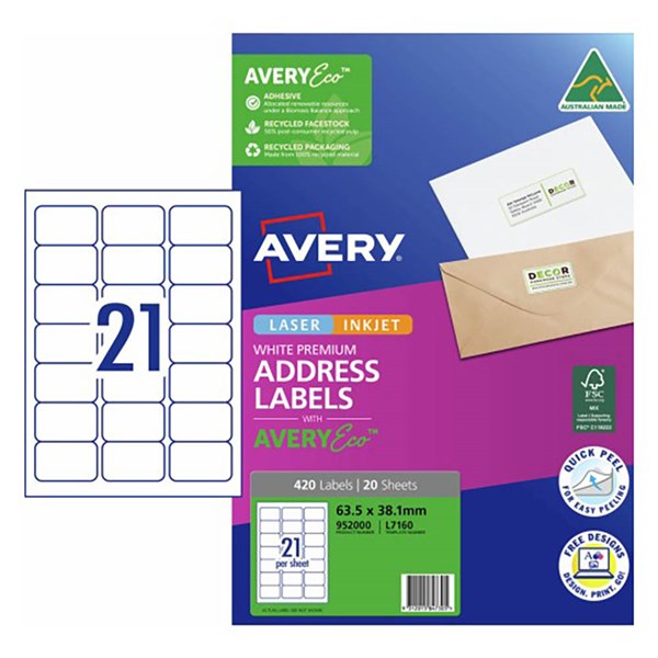 AVERY 952000 L7160-20 LASER LABEL 21/SHT 63.5X38.1MM WHITE PK20SHTS