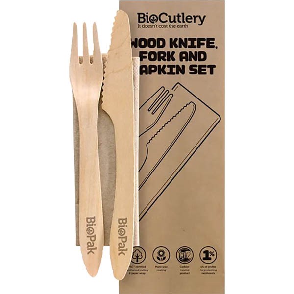 BIOPAK BIOTABLEWARE WOODEN KNIFE, FORK, NAPKIN SET WAX COATED 190MM PACK 100