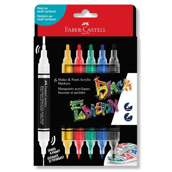 Create bold and expressive marks on multiple surfaces with Faber-Castell black edition shake and paint acrylic markers
