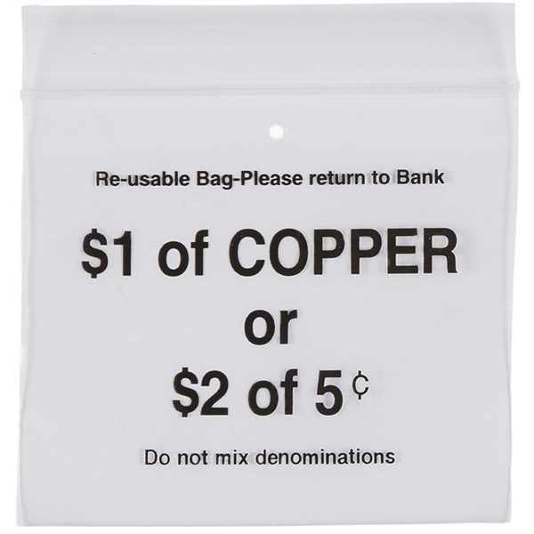 Cumberland clear plastic Press Seal coin bags with denominations and values for 5c, 10c, 20c, 50c, $1, $2 coins printed black