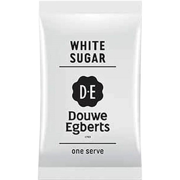 Douwe Egberts branded individually wrapped single serve sachets of white sugar