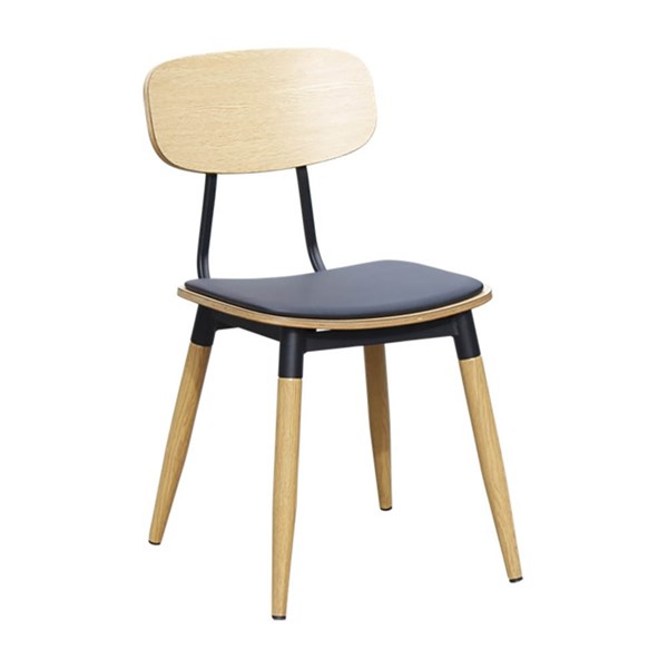 The Austin Chair by Durafurn combines sleek design and durability, featuring a steel frame with a wood finish and a black PU vinyl seat