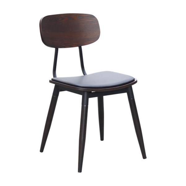 The Austin Chair by Durafurn combines sleek design and durability, featuring a steel frame with a wood finish and a black PU vinyl seat