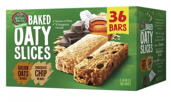 Mother Earth Baked Oaty Slices bring soft-baked whole-grain goodness to your snack line-up. Each carton holds 36 individually wrapped 40 g slices (1.44 kg total), baked in New Zealand with Australian and New Zealand oats and dotted with chocolate pieces for extra flavour