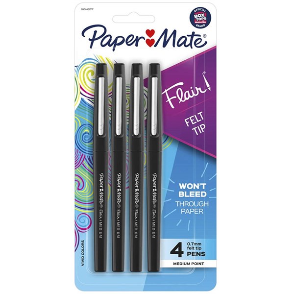 PAPERMATE FLAIR FELT TIP PEN MEDIUM 0.7MM BLACK PACK 4