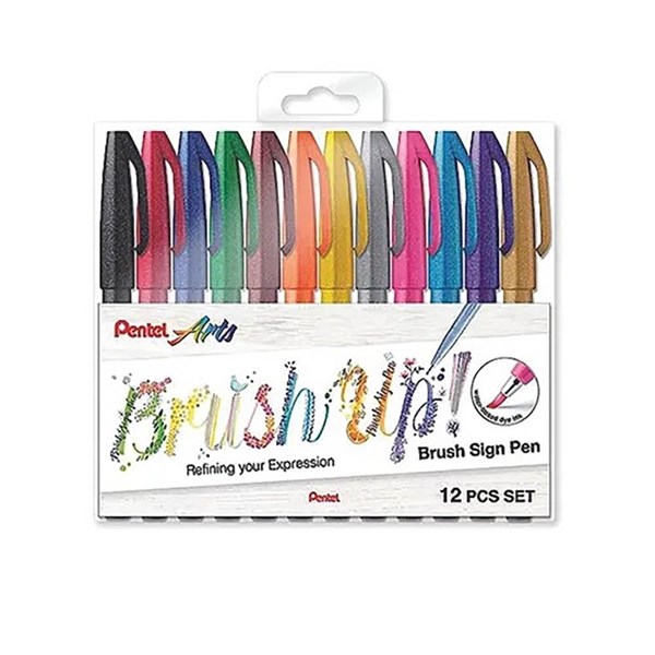 PENTEL ARTS BRUSH SIGN PEN STANDARD ASSORTED COLOUR PACK 12