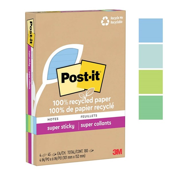 POST-IT 4621R-4SST SUPER STICKY NOTES 101 X 152MM RECYCLED LINED OASIS PACK 4