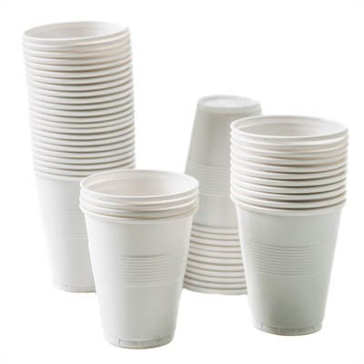• Disposable white plastic drinking cups for the Refresh water cooler dispenser