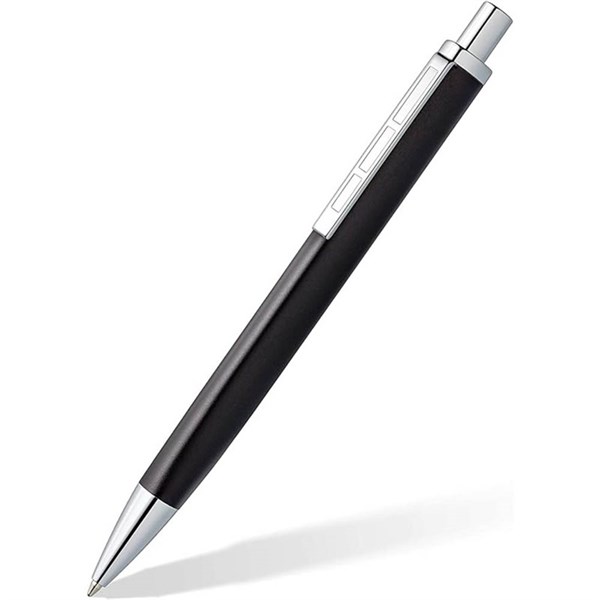 • The clip, push button, and nib are high polished silver, with the STAEDTLER Mars head embossed on the top of the push button and STAEDTLER lettering all around the upper decorative ring