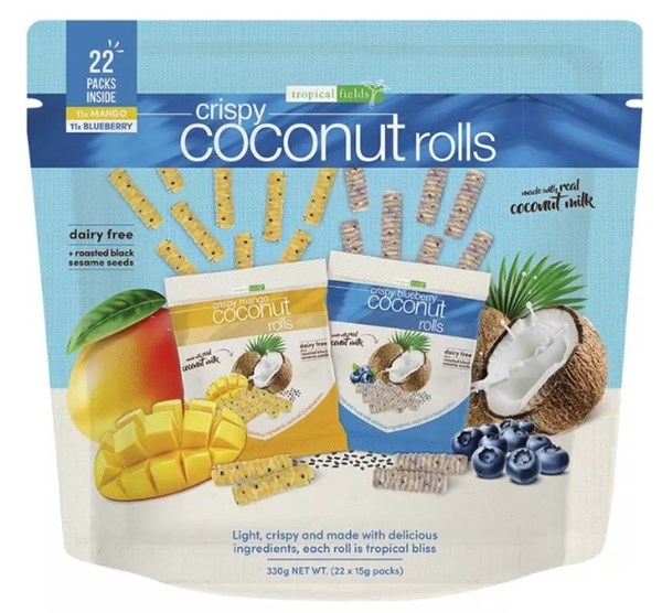 • Snack like you?re on holidays. These oven-baked coconut rolls are feather-light, super-crispy and finished with a sprinkle of black sesame. Each carton gives you 22 single-serve packs (two flavours inside ? mango and blueberry), perfect for lunch boxes, grazing boards or that 3 pm pick-me-up