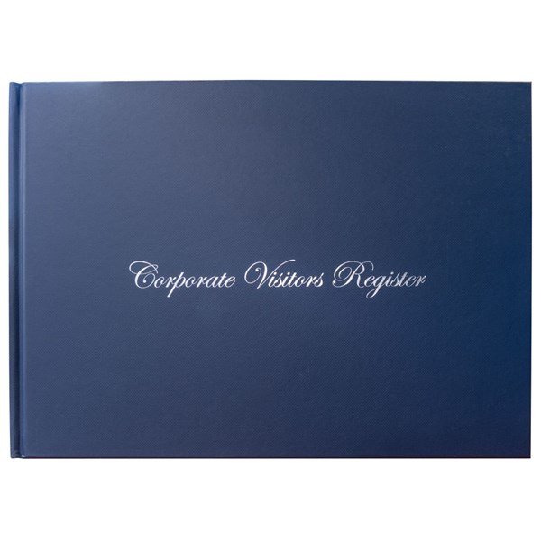 • The book has a navy hard cover with cursive writing on the front to give your reception area and elegant touch