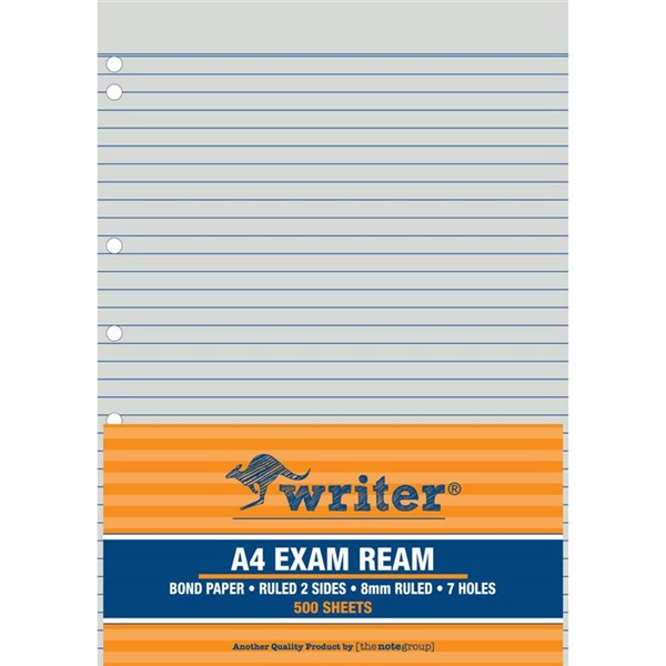 WRITER EXAM PAPER 55GSM 8MM RULED + MARGIN 7 HOLE PUNCH A4 WHITE 500 SHEETS
