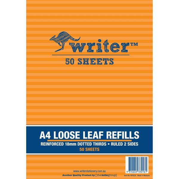 WRITER LOOSE LEAF REFILL REINFORCED 18MM DOTTED THIRDS 57GSM A4 50 SHEET
