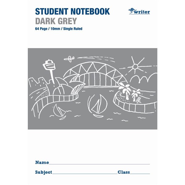 WRITER STUDENT NOTEBOOK 10MM SINGLE RULED 64 PAGE 250 X 175MM DARK GREY