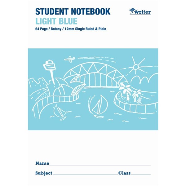 WRITER STUDENT NOTEBOOK PLAIN/SINGLE RULED 12MM 64 PAGE 250 X 175MM LIGHT BLUE